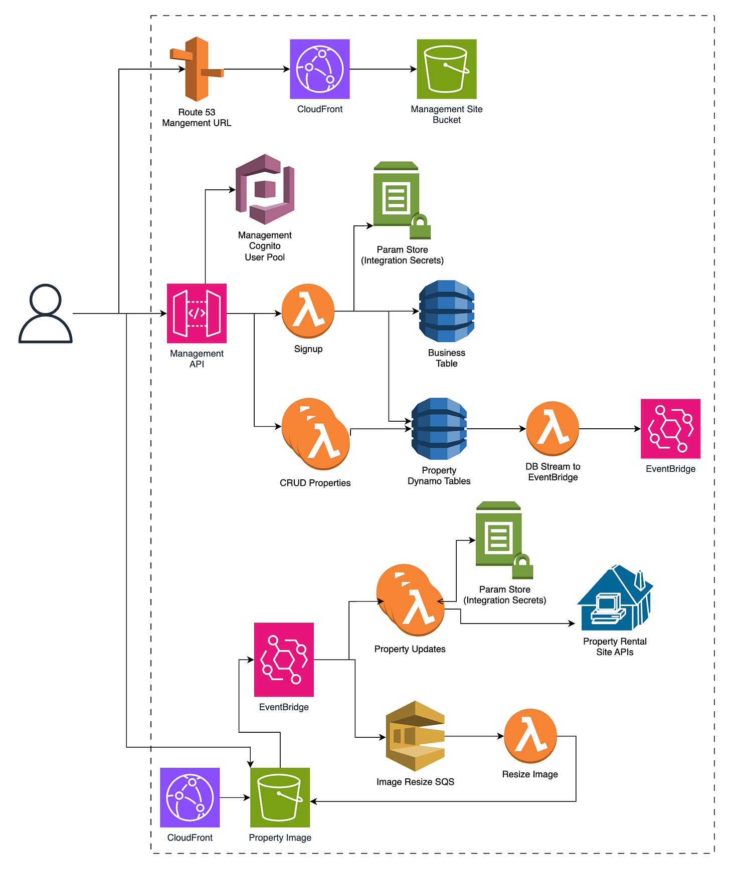We need to be able to send any of the changes to the business or the property to the other holiday rental sites. When a business signs up, they can select which of the sites they are on and paste in the two secrets for each integration (API key for sending data, secret for validating incoming events) which we store in param store.