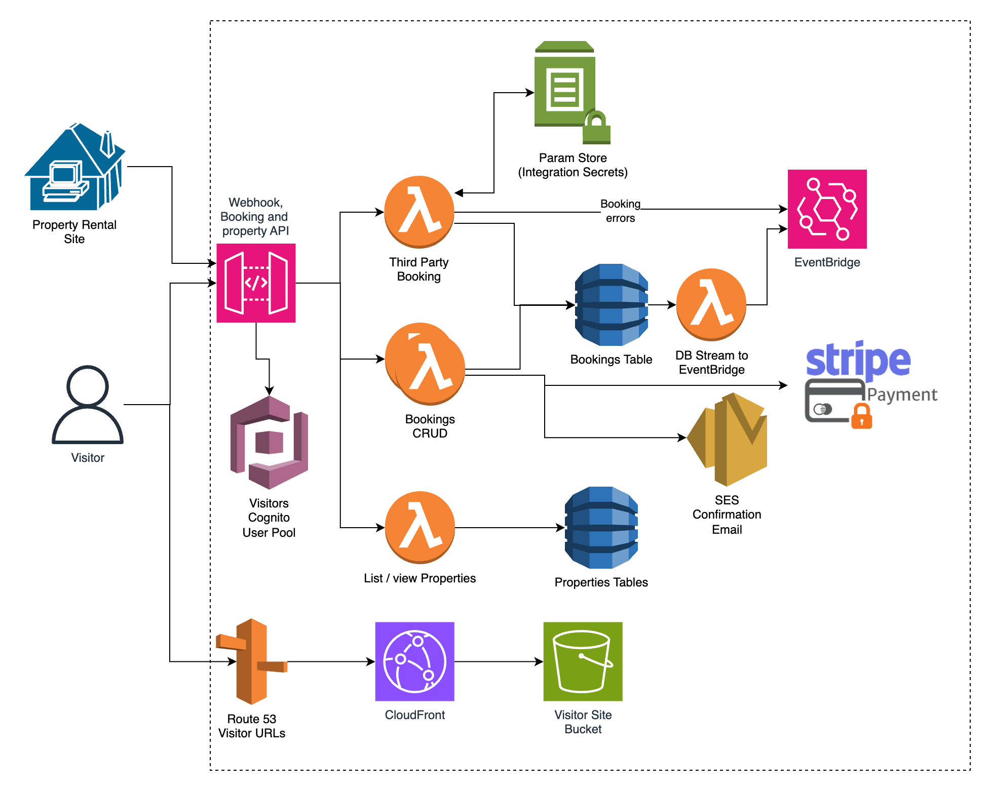- Property owners have the businessID as an attribute on their cognito user. This can be accessed inside any API Lambda that uses auth. This is what is used to query on properties and bookings instead of a owner passing their businessId manually, which could be falsely passed. In the Lambda a role is created with permissions that are limited to dynamo records with that business IDAt the requested scale the application might be over 300,000 bookings a year (400 owners, 15 properties, 50 bookings per year). How does your architecture handle this? Take note of limits in your email service provider and auth platform.